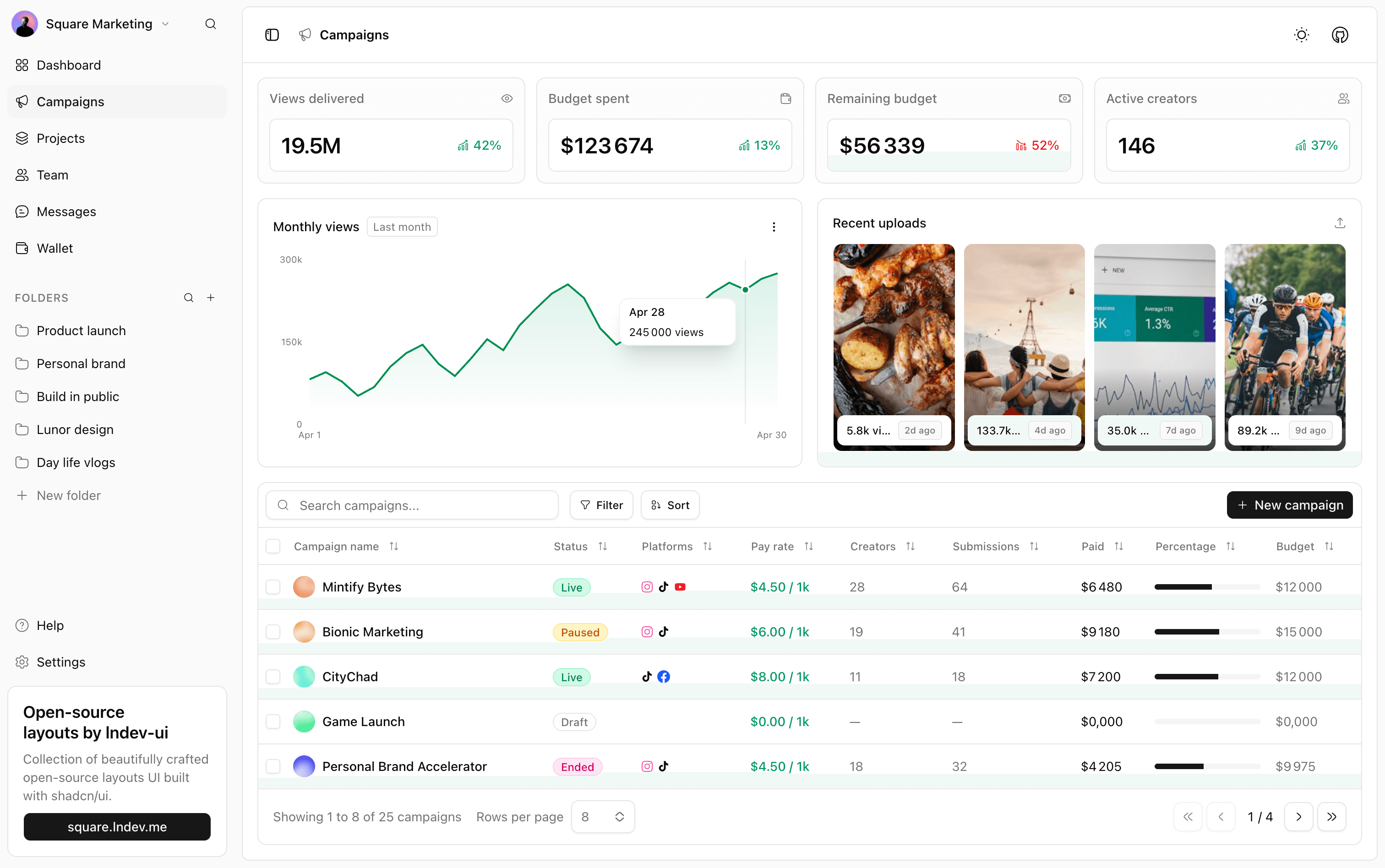 Creator marketing dashboard with campaigns, analytics, views chart, and recent uploads management.