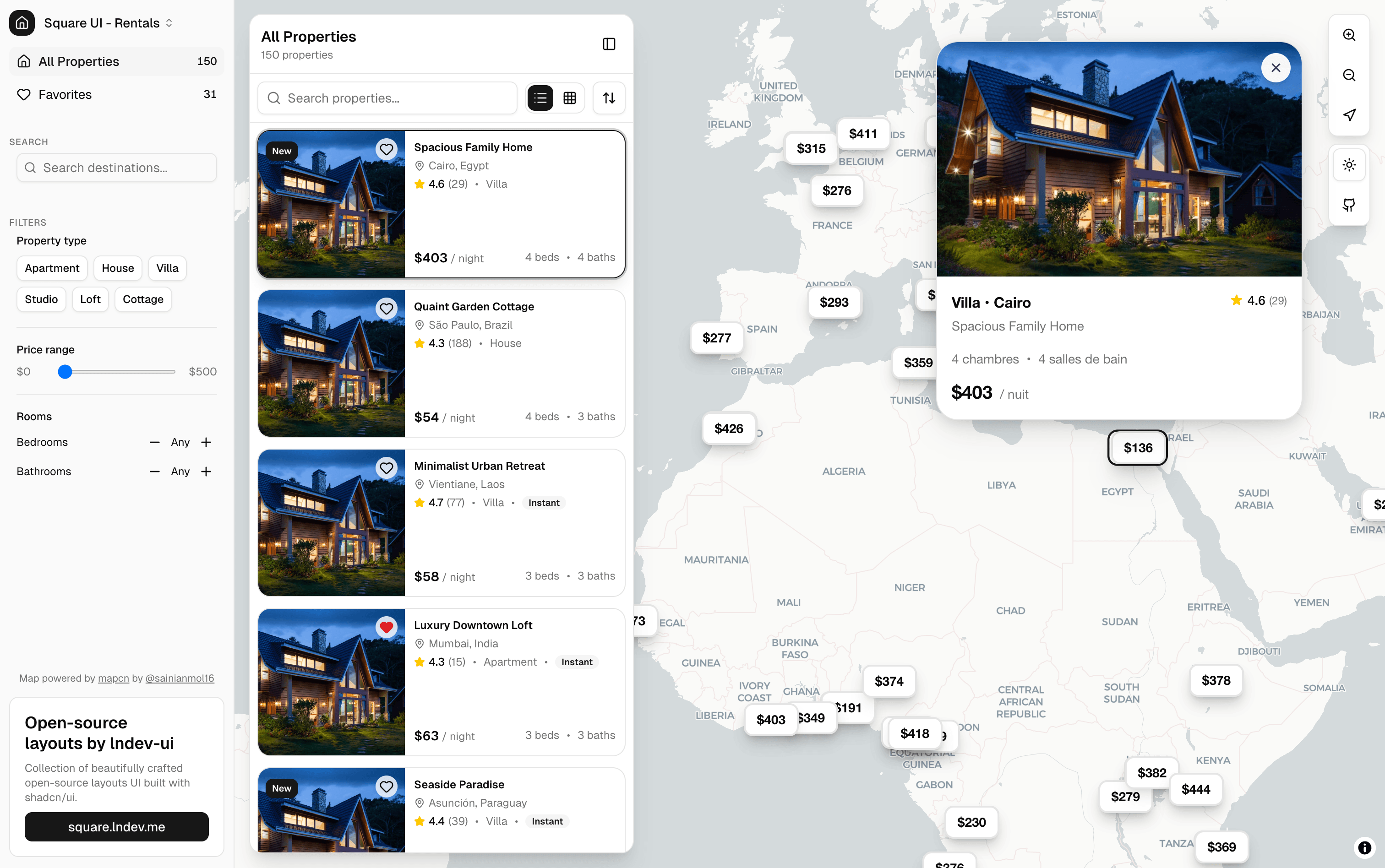 Modern rental property platform with interactive map, property listings, filters, and search.
